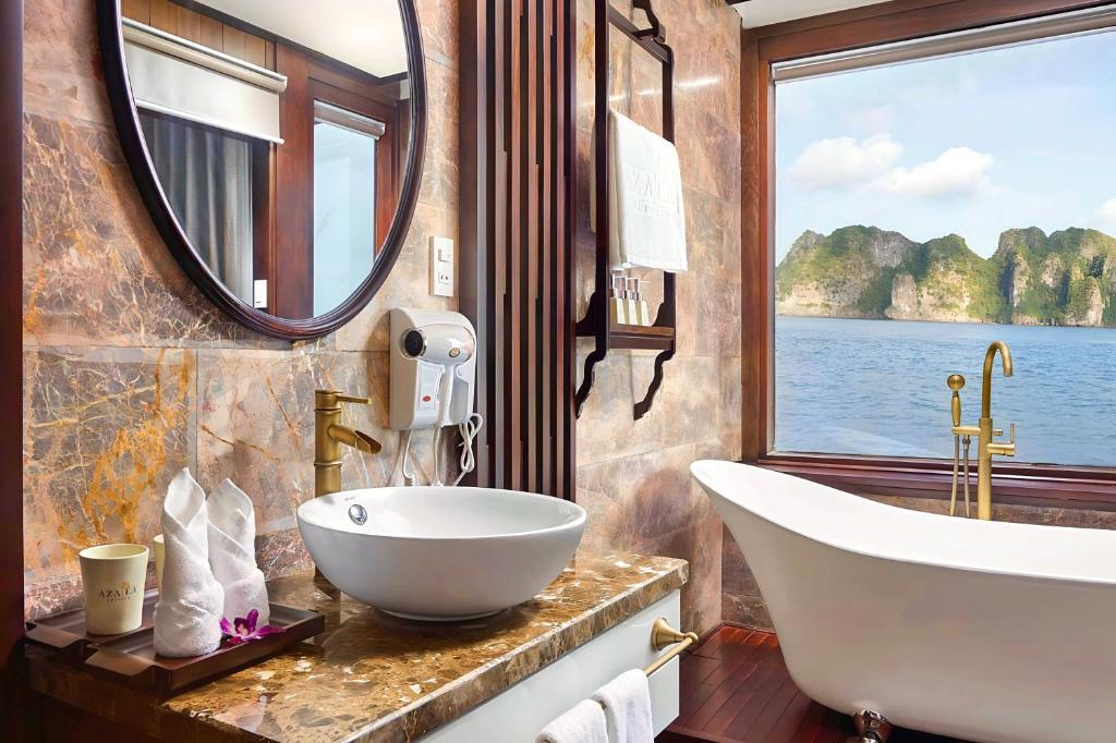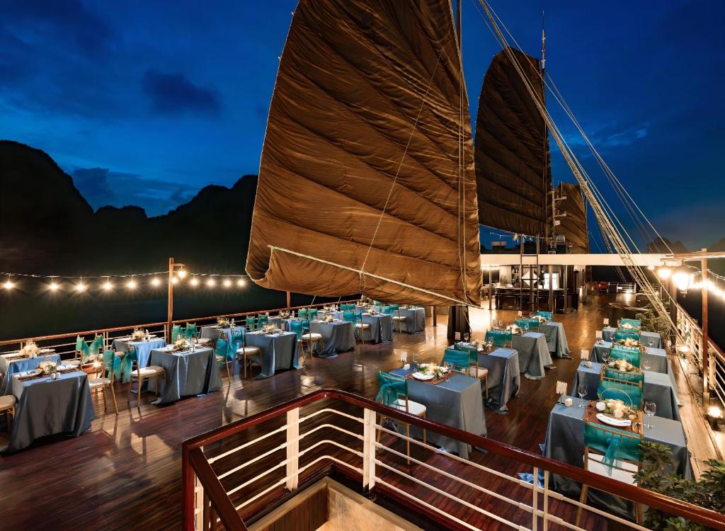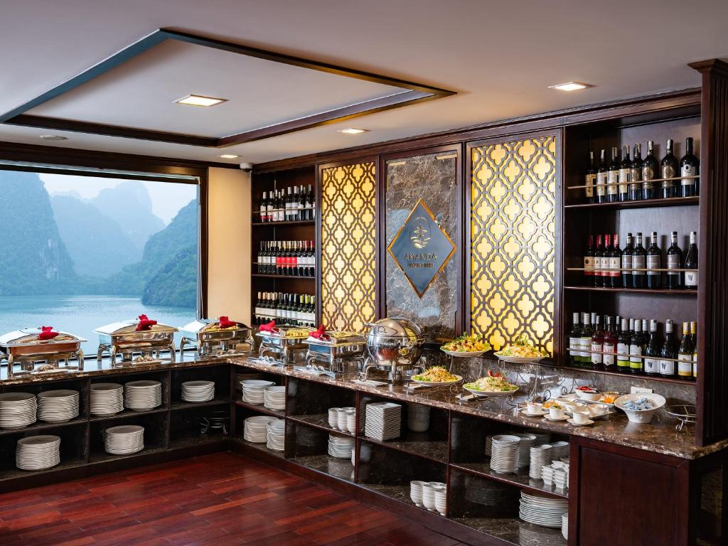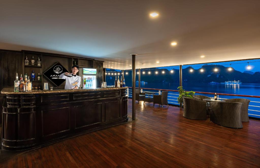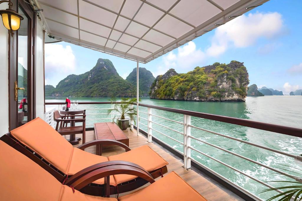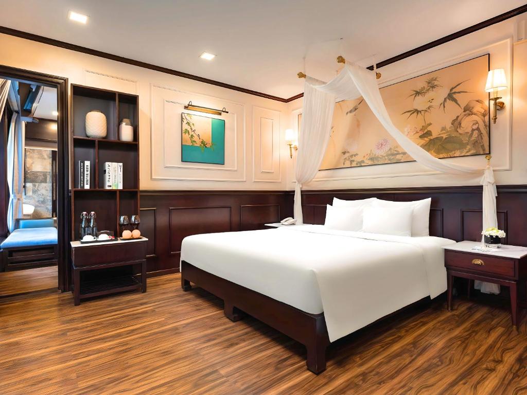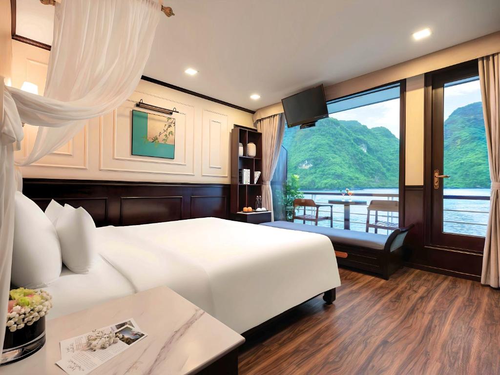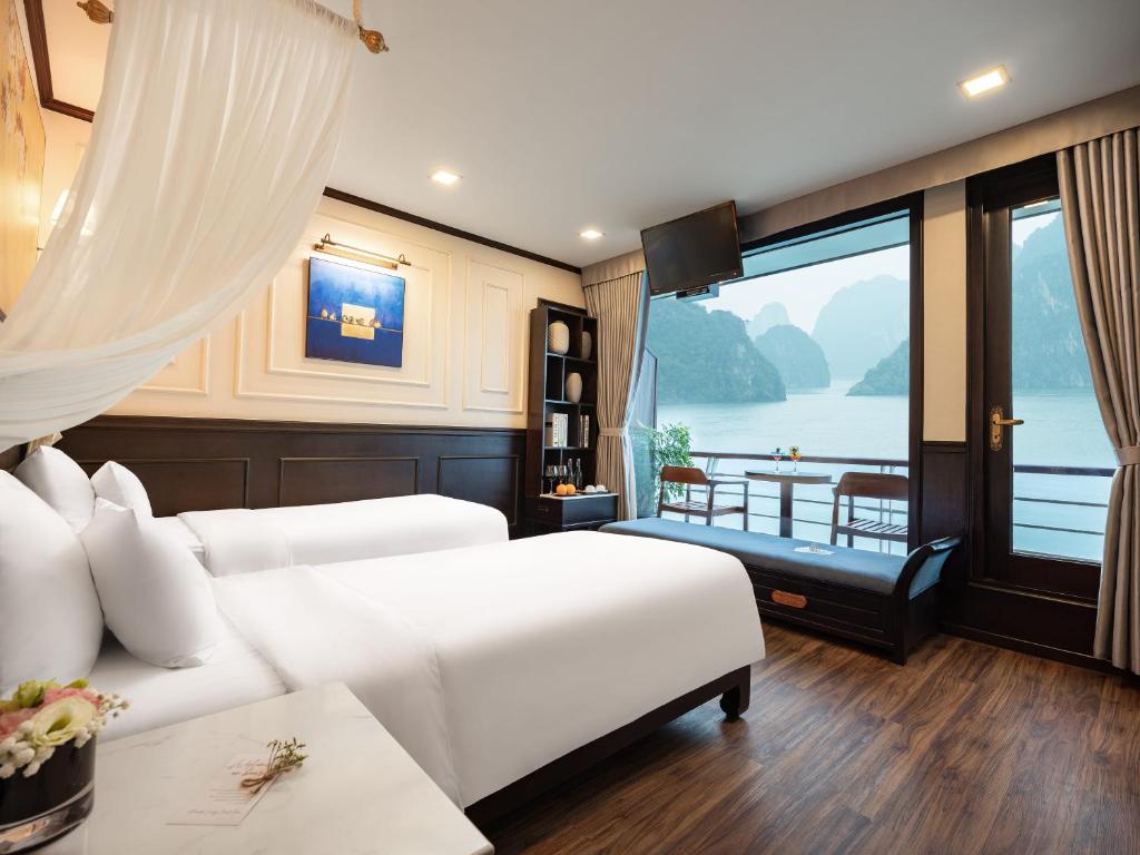 Amanda Luxury Cruise in Ha Long offers a 5-star cruise experience with a private beach area, beachfront, rooftop swimming pool, spa facilities, sun terrace, water sports, open-air bath, restaurant, bar, and free WiFi.Guests enjoy sea views, air-conditioning, private bathrooms, balconies, terraces, and modern amenities such as mini-bars, flat-screen TVs, and soundproofing. Additional facilities include a lounge, outdoor fireplace, hot tub, and electric vehicle charging station.