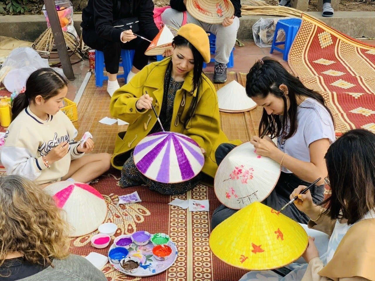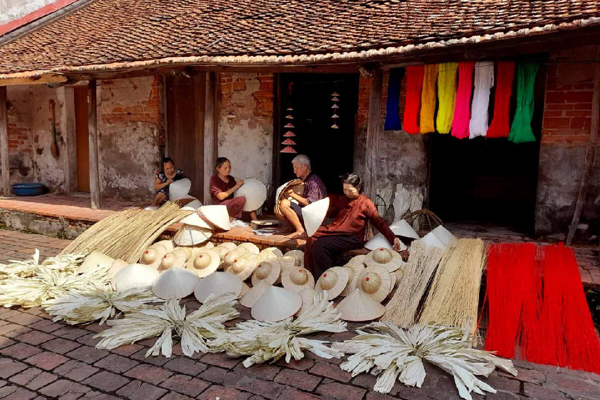 10:15. Leave for Chuong Village that has been well-known forr the craft of conical hat - making for over 300 years . Meet the local artisans and observe how conical hats are made . You will have a chance to draw by your own on hats than take home for souvenir