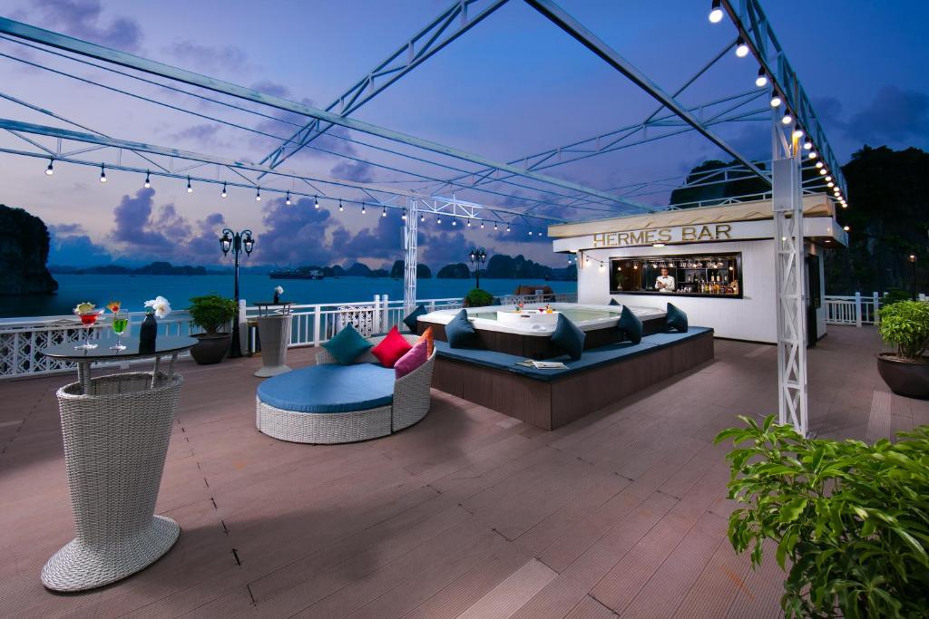 " times=""><strong>18:00 </strong>Enjoy Halong sunset canape with snacks are served before the main oarty as: Seasonal fresh fruits plate,Smoked duck breast, Ham and cheese canape, potatoes chips ,… </span></p>