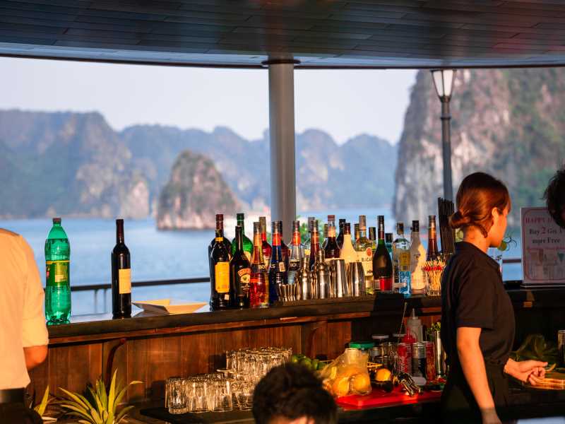 Enjoy a Happy Hour time – BUY ONE GET ONE FREE at the bar. It is an ideal time for photography enthusiasts to capture the greatest moment of sunset over Lan Ha Bay.