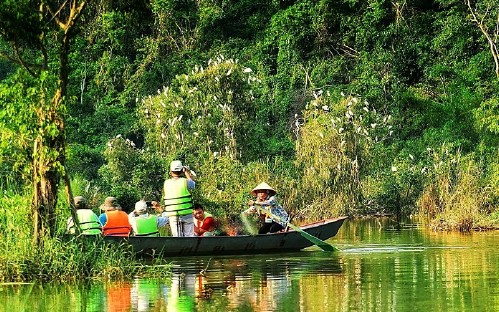 15:00: Explore Hang But (Buddhist Cave) The cave 500m in length, magical view of the stalactites and stalagmites, including a big Buddha-shaped stalactite sitting beside an underground river. Then get on a small sampan to visit Thung Nham bird park, discover the most features of this area with more than 50.000 birds of 40 species flying to inhabit every day.