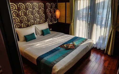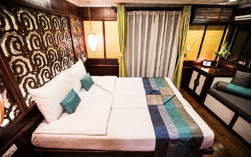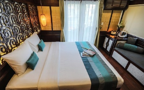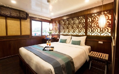 The Bhaya Classic boats are wooden boats constructed in the traditional oriental style long favoured by shipbuilders in this area. The construction material and style of the boats give them a classic feel which sets them apart from most cruise vessels around the world. On board, you will find atmospheric spaces which speak of the heritage design, and the small boat concept encourages a cosy feel which makes a Bhaya Classic cruise a pleasantly social affair. The colour scheme on board is a fusion of the rich browns of hardwood, white, and turquoise blue trim with red highlights. The wooden furniture on board only heightens the sense of timeless elegance which seems a natural extension of Halong Bay itself.