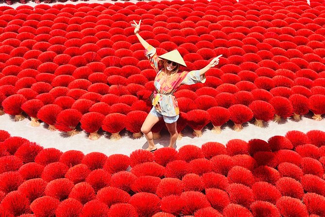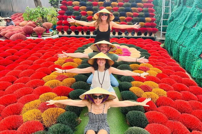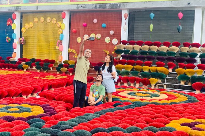 9:30 . Visit Quang Phu Cau village , which has been producing incense more for than 100 years . Take a walk to the center of the village and see how locals make incense at an artisanal , family scale . Learn the process how incense is made from scratch and more about the lives of manual workers. Meet a family who specializes in dyeing incense sticks and admire the outdoor showroom with a thousands of the colorful bundles of incense . Here , our guide with taken the best photos for you
