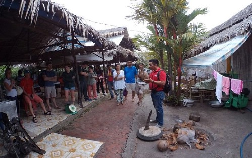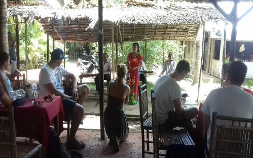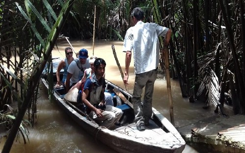 Then a boat ride to An Khanh – a less touristy attraction in Ben Tre, enjoy cruising on a hand-rowed sampan under the shade of water coconut trees along natural canals, then enjoy seasonal fruit & honey tea to the sound of "Southern Vietnamese folk music", performed by the locals.
