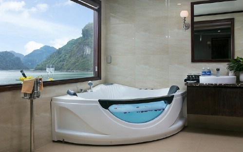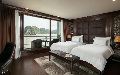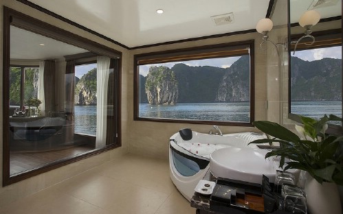• 12:00: Embark Mon Chéri Cruises. You will be served a welcome drink and provided with a cold towel. This will be followed by a cruise briefing where you will also be given safety instructions before checking in to your cabin. We will set sail and you will have lunch in Mon Cheri's luxury restaurant while enjoying the beauty of the canals on our way to Halong Bay.