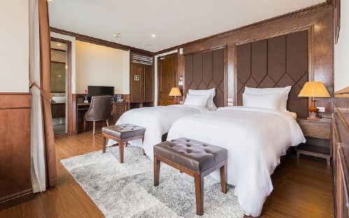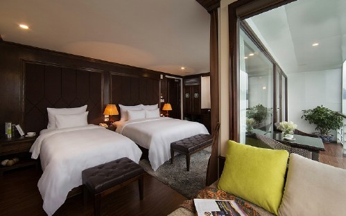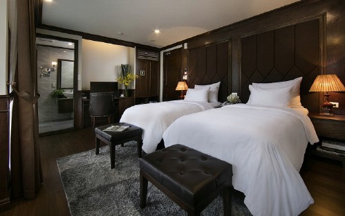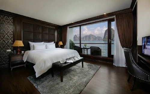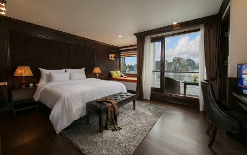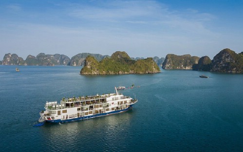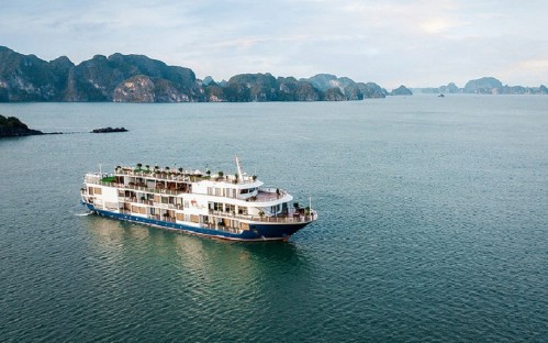 • 12:00: Embark Mon Chéri Cruises. You will be served a welcome drink and provided with a cold towel. This will be followed by a cruise briefing where you will also be given safety instructions before checking in to your cabin. We will set sail and you will have lunch in Mon Cheri's luxury restaurant while enjoying the beauty of the canals on our way to Halong Bay.