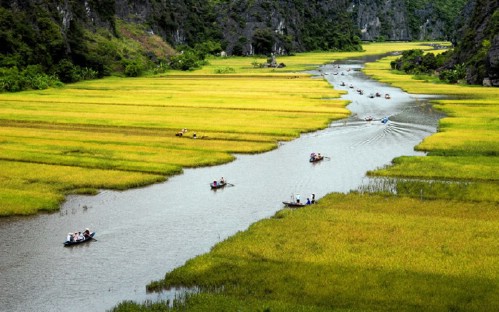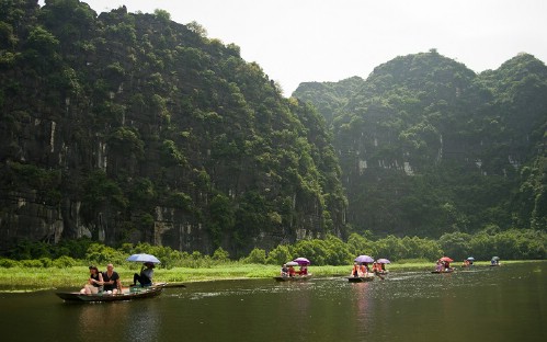 • 13:00: Discovering Tam Coc on the sampan (bamboo boat). With nearly 2 hours, tourists will have chance to mix with the local life, river, limestone mountains, fields… Passing through 3 caves: Hang Ca- first cave, Hang Hai- second cave, Hang Ba- the third cave by boat will bring to you excited feeling