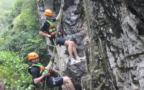 Dry cliff at 18 m - First activity, After we mastered the skills to rappel down the steep cliffs. Quiver is for sure because of the first time to test your skills but very excited to launch yourself into the air and landed safely.
